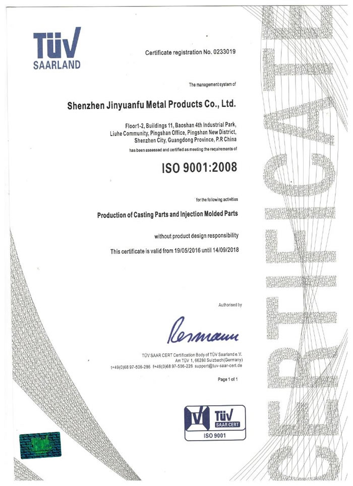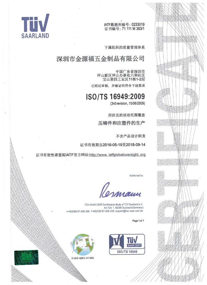深圳市金源福五金制品有限公司成立于2003年。公司擁有8000多平方米生產(chǎn)廠地、開發(fā)與管理精英人才、技術(shù)專業(yè)、設(shè)備精良、交通便利、服務(wù)周全、具體設(shè)計(jì)、開發(fā)、制模、出樣、生產(chǎn)到成品出貨一體化模式生產(chǎn)廠家。已通過ISO9001:2008ISO1440/TS16949:2009國際質(zhì)量體系認(rèn)證。專業(yè)生產(chǎn)鋅合金壓鑄、鋁合金壓鑄產(chǎn)品、汽車配件、汽車后視鏡支架、車載導(dǎo)航散熱器、LED散熱器、LED燈罩、數(shù)碼電子五金結(jié)構(gòu)件、家具五金裝飾件、標(biāo)牌(LOGO)等五金壓鑄產(chǎn)品。